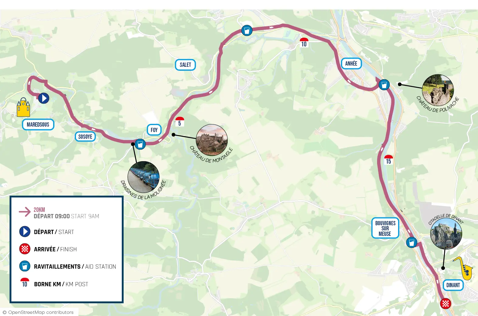 La vallée de la Molignée, c'est un décor unique, varié et riche en couleurs. Avec son tracé en ligne droite et son profil plat-descendant, traduit par un dénivelé négatif de 138m en pente très douce, le parcours du 20km Maredsous-Dinant s'avèrera être le parcours le plus rapide et accessible que vous ayez couru. Ajoutez à cela des variations de paysages, des vues à couper le souffle et des effets tunnels dans la végétation, ce parcours vous transportera dans un univers atypique.
